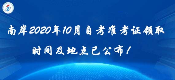 根據《2020年10月自考重慶南岸區考生報名須知》知悉,2020年10月重慶南岸區自考準考證領取時間及地點如下: